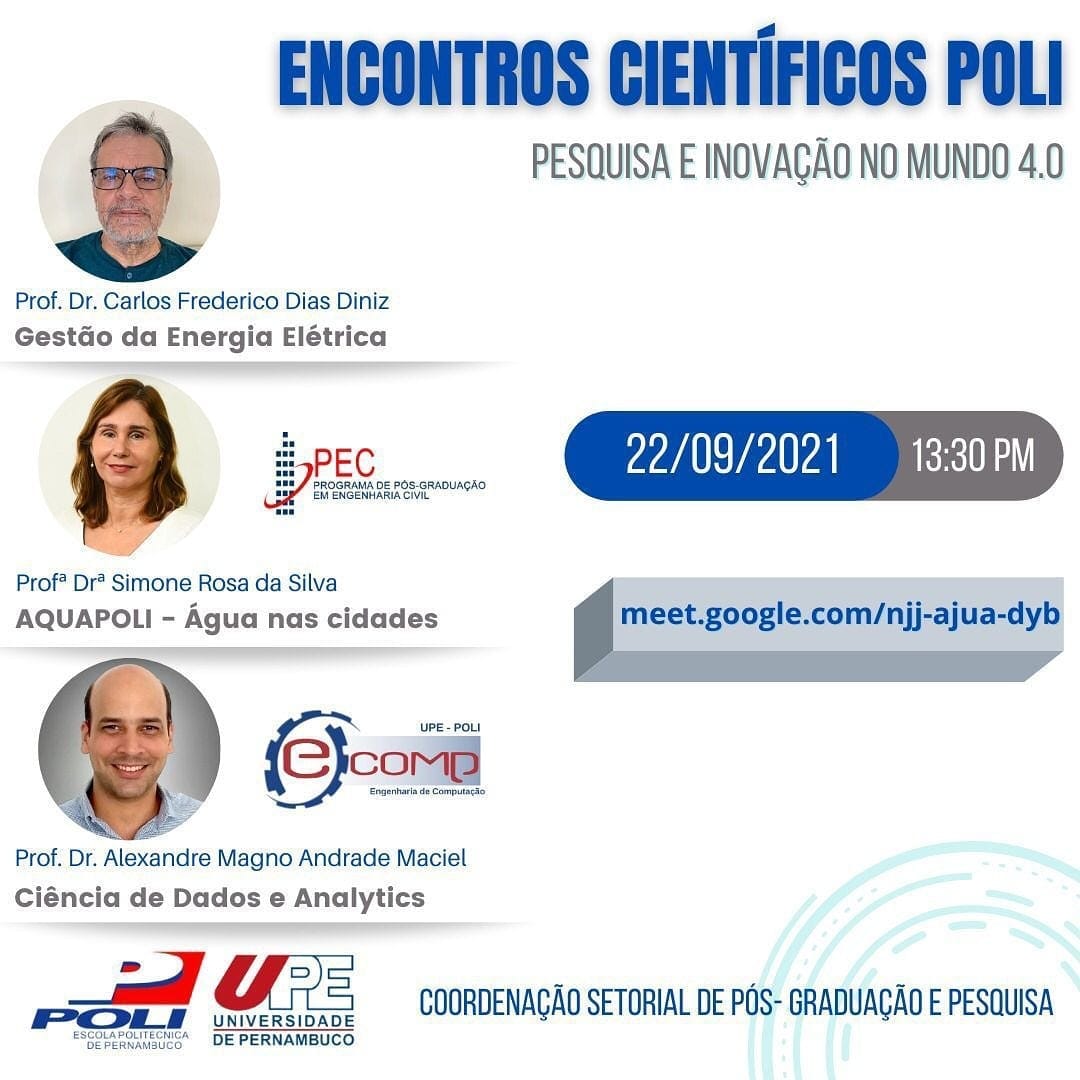 A Coordenação Setorial de Pós-graduação e Pesquisa da Escola Politécnica da Universidade de Pernambuco realiza mais um de seus de eventos quinzenais denominados Encontros Científicos Poli: Pesquisa e Inovação no Mundo 4.0. Líderes de grupos de pesquisa vinculados à instituição divulgam para a comunidade os seus saberes e projetos, de maneira a encontrar pontos de interseção e colaboração multidisciplinar.
