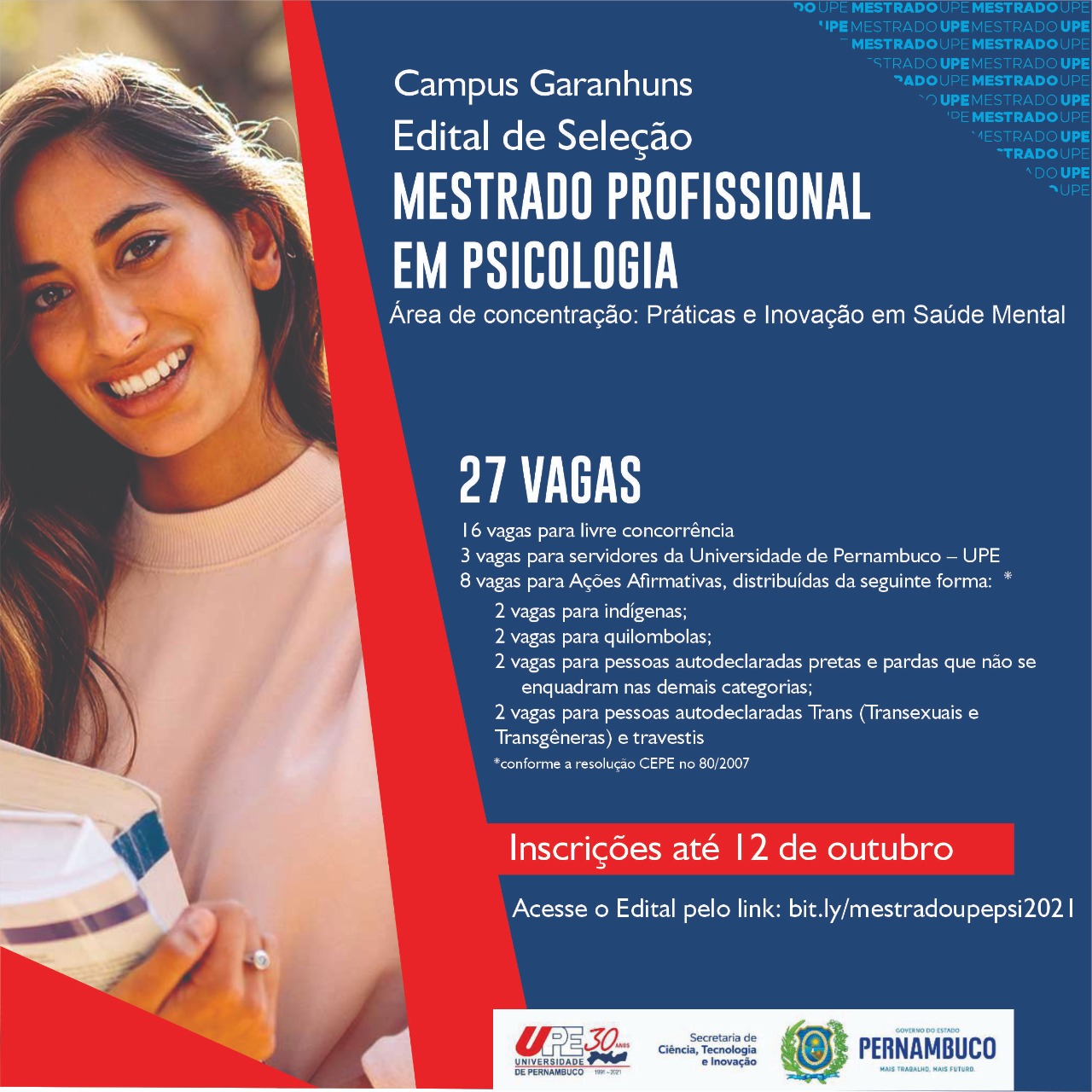 O Programa de Pós-Graduação em Psicologia Práticas e Inovação em Saúde Mental do Campus Garanhuns da Universidade de Pernambuco está com inscrições abertas, até o dia 12 de outubro, para seu Curso de Mestrado Profissional em Psicologia. Um terço das vagas está destinado para Políticas Afirmativas, garantindo espaço para candidatos indígenas, quilombolas, pretos e pardos e autodeclarados trans e travestis.