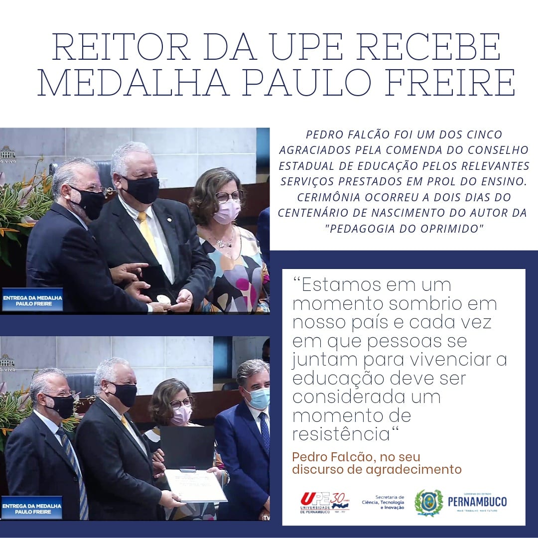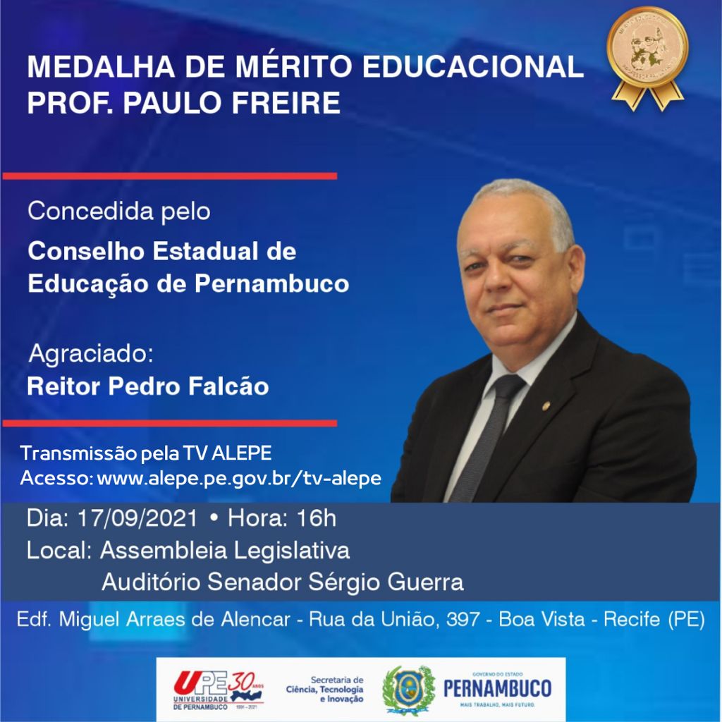 O reitor da Universidade de Pernambuco (UPE) Pedro Falcão recebeu, na tarde desta sexta-feira (17), a medalha de Mérito Educacional Professor Paulo Freire, concedida desde 2001 pelo Conselho Estadual de Educação a pessoas e instituições que prestaram relevantes serviços em diferentes áreas do ensino.