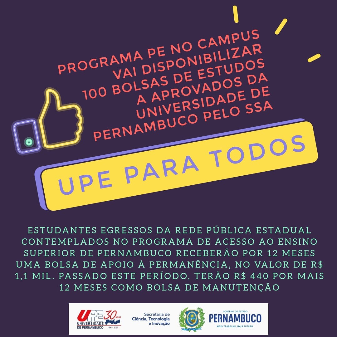 O PE no Campus - Programa de Acesso ao Ensino Superior de Pernambuco - vai destinar 100 bolsas a estudantes aprovados no Sistema Seriado de Avaliação (SSA) da Universidade de Pernambuco (UPE) egressos da rede estadual de ensino. O número corresponde a 10% de todos os beneficiados do programa em 2021. A decisão consta do Decreto 51.299, publicado no Diário Oficial do Estado no sábado (4).