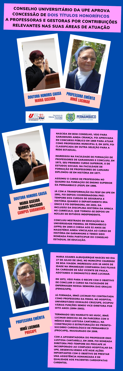 A Universidade de Pernambuco (UPE) vai conceder títulos de Doutora Honoris Causa e Professora Emérita a duas docentes e gestoras pelas contribuições relevantes nas suas áreas de atuação no Campus Garanhuns e no Pronto-socorro Cardiológico Universitário de Pernambuco Prof. Luís Tavares (Procape).