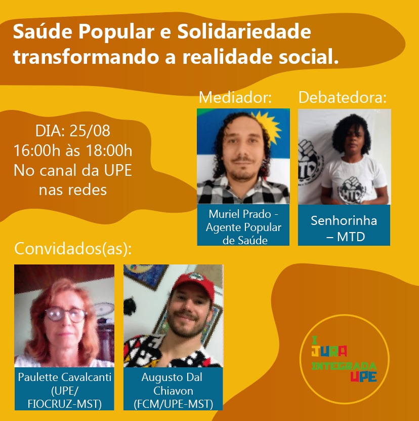 Com mediação de Muriel Prado (Agente Popular de Saúde), haverá a presença de Paulette Cavalcanti (UPE/Fiocruz/MST) e Augusto Dal Chiavon (UPE-FCM/MST) como convidados, e Senhorinha Joana (Movimento de Trabalhadoras e Trabalhadores por Direitos - MTD) como debatedora.