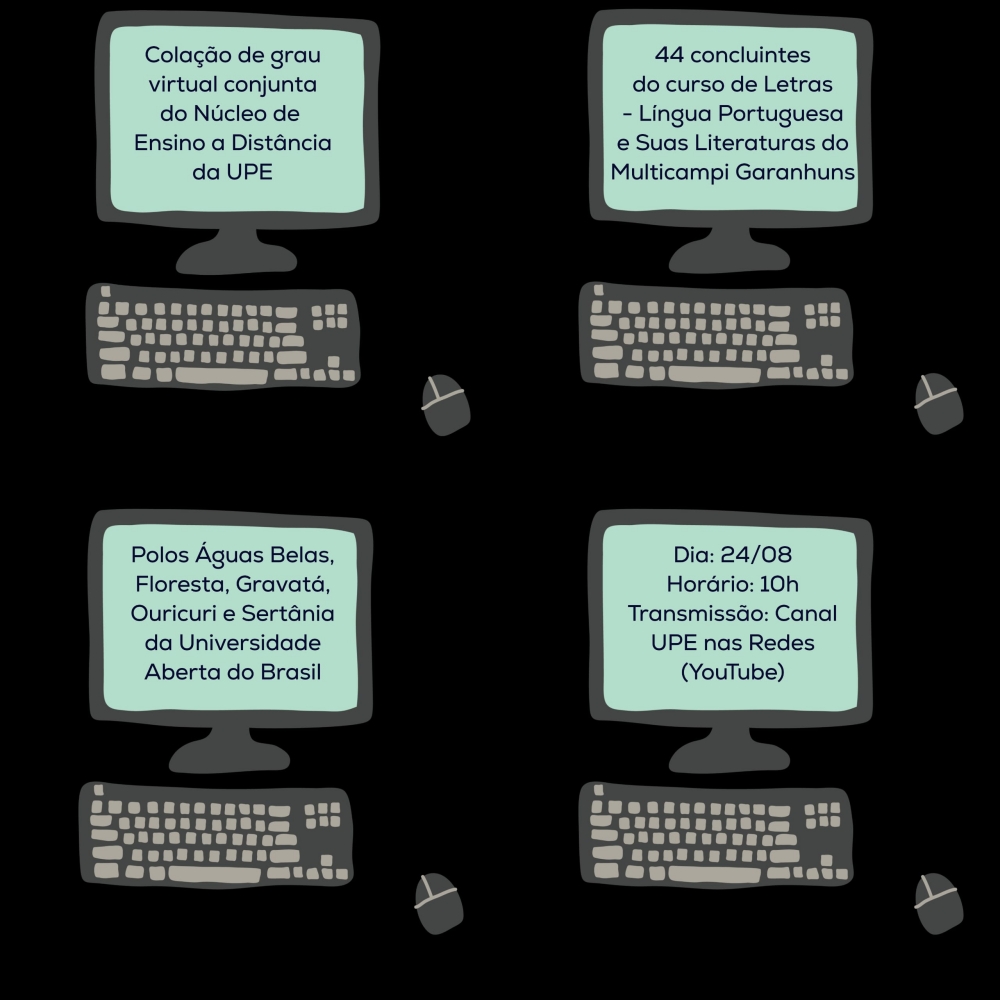 A Universidade de Pernambuco (UPE) realiza, às 10h de terça-feira (24), uma cerimônia de colação de grau virtual conjunta de 44 concluintes do curso de Letras – Língua Portuguesa e Suas Literaturas na modalidade Ensino a Distância (EaD).
