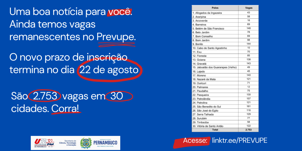 O Pré-vestibular da Universidade de Pernambuco (Prevupe) disponibiliza, até as 23h59 do dia 22 de agosto, as matrículas para 2.753 vagas remanescentes em 30 municípios do estado.