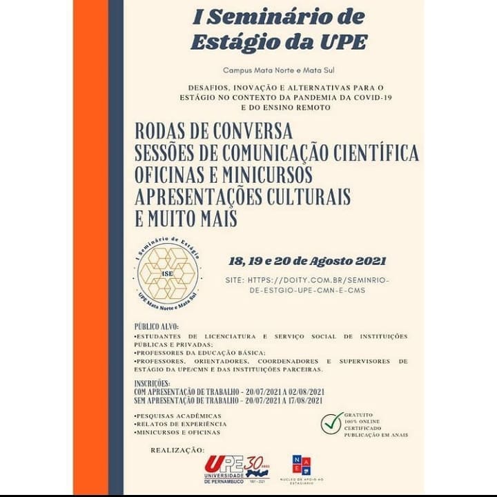 As inscrições podem ser feitas no site https://doity.com.br/seminrio-de-estgio-upe-cmn-e-cms.