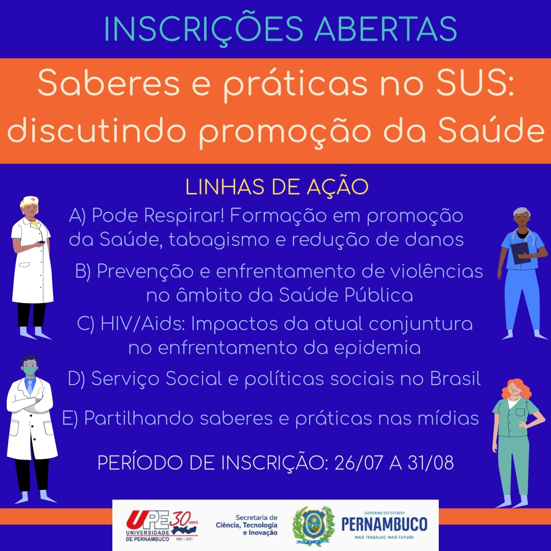 a) Pode Respirar! Discutindo Promoção da Saúde no SUS/UPE: Formação em Promoção da Saúde, Tabagismo e Redução de Danos; Ciclo de Estudos e Debates em Saúde Pública do projeto de extensão Pode Respirar; Formação em A Centralidade da Família na agenda das políticas setoriais: Desafios e enfrentamentos para profissionais de Saúde.