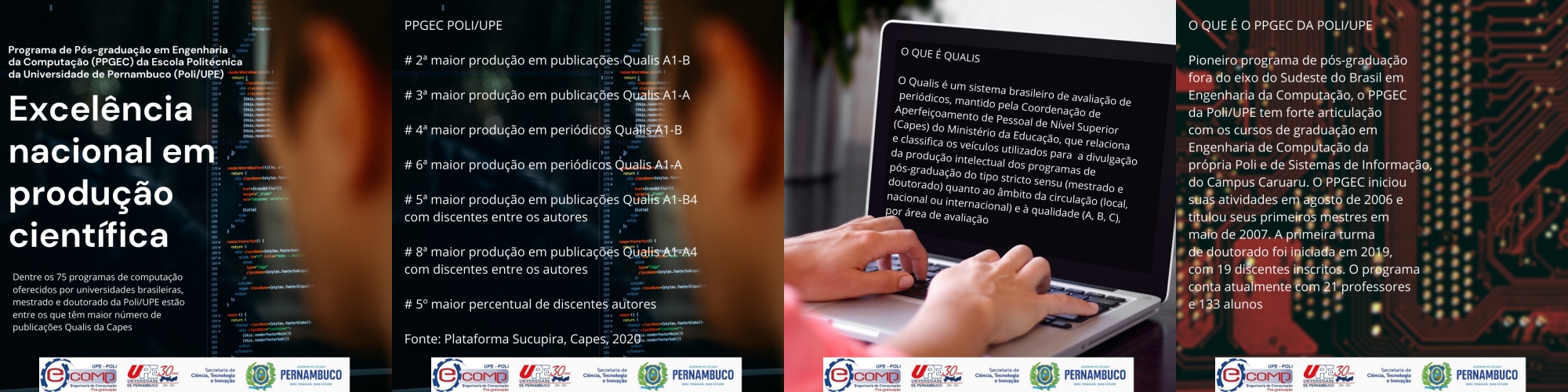 Dentre os 75 programas de computação oferecidos por universidades brasileiras, segundo dados da Capes de 2020, o PPGEC da Poli/UPE está entre os dez com maior produção em publicações Qualis. A fonte é a Plataforma Sucupira da própria Capes.