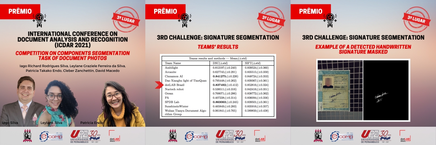 Um time formado por cinco pesquisadores de universidades pernambucanas conquistou o terceiro lugar na Competition on Components Segmentation Task of Document Photos, uma competição mundial de análise e reconhecimento de documentos, um campo de crescente importância na era atual da transição digital, que aconteceu na International Conference on Document Analysis and Recognition (ICDAR 2021). O feito foi obtido no desafio “Signature Segmentation”, que envolvia detectar e segmentar assinaturas manuscritas em documentos de identificação.