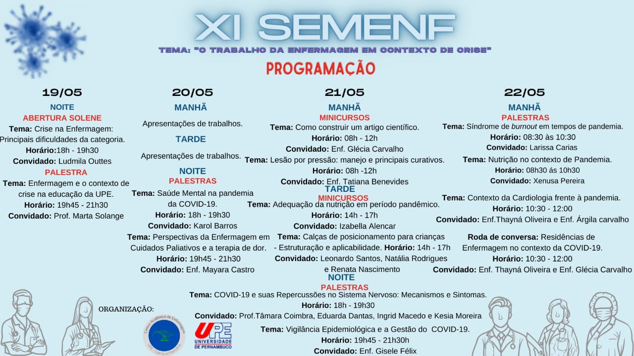 Neste ano, o tema nacional é “O trabalho da enfermagem em contexto da crise”. As dificuldades da categoria em relação à pandemia de coronavírus serão abordadas em diversos encontros. Palestrantes falarão sobre questões como síndrome de Burnout, adequação da nutrição em período de Covid-19 e saúde digital.