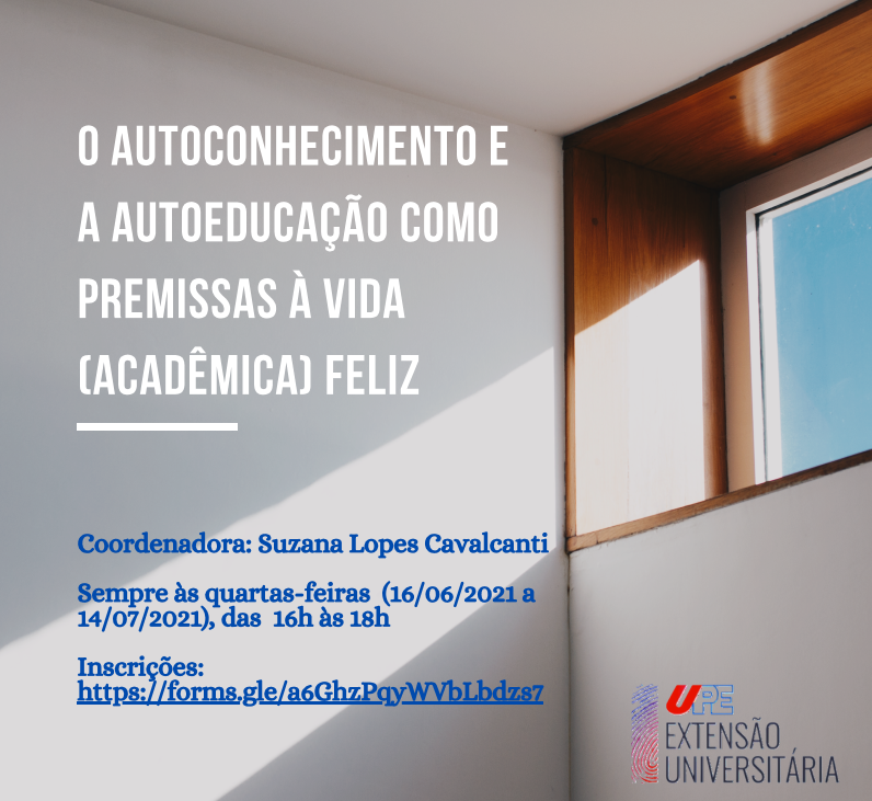 Estudantes de graduação da Universidade de Pernambuco podem se inscrever no curso de extensão “O autoconhecimento e a autoeducação para uma vida (acadêmica) feliz”, coordenado pela professora da Escola Superior de Educação Física (ESEF/UPE) Suzana Lopes Cavalcanti.