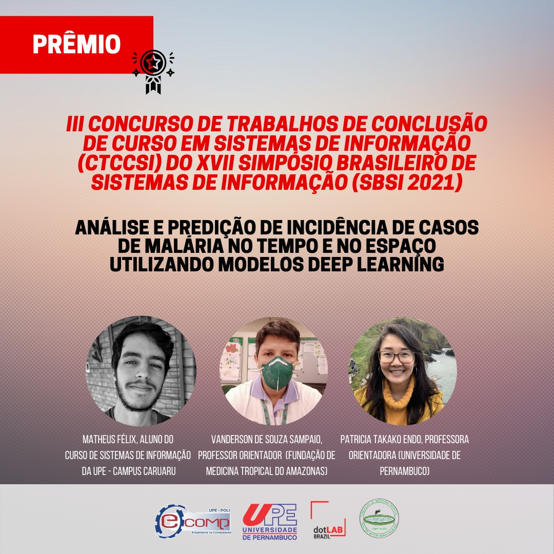 A monografia intitulada "Análise e predição de incidência de casos de malária no tempo e no espaço utilizando modelos deep learning" do aluno do bacharelado em Sistemas de Informação do Campus Caruaru da Universidade de Pernambuco, Matheus Félix, foi aceita no III Concurso de Trabalhos de Conclusão de Curso em Sistemas de Informação (CTCCSI) do XVII Simpósio Brasileiro de Sistemas de Informação (SBSI 2021). Atualmente mestrando do Programa de Pós-Graduação em Engenharia da Computação da UPE, Matheus Félix teve a orientação dos professores Vanderson de Souza Sampaio (Fundação de Medicina Tropical do Amazonas - FMT) e Patricia Takako Endo (UPE).