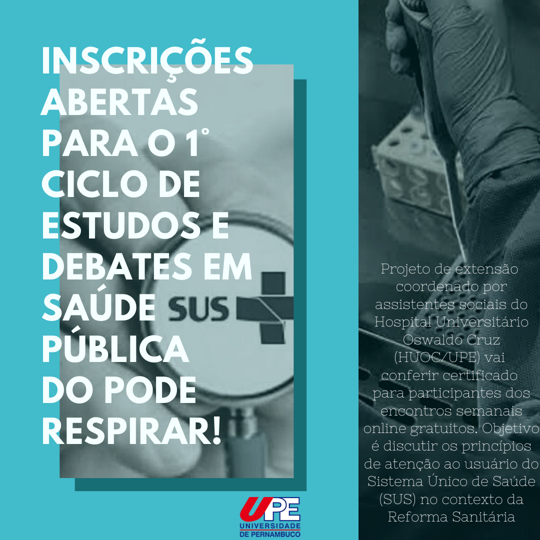 Residentes, profissionais e discentes da área de Saúde Pública podem se inscrever para participar do I Ciclo de Estudos e Debates em Saúde Pública promovido pelo Pode Respirar!, um projeto de extensão da Universidade de Pernambuco (UPE).