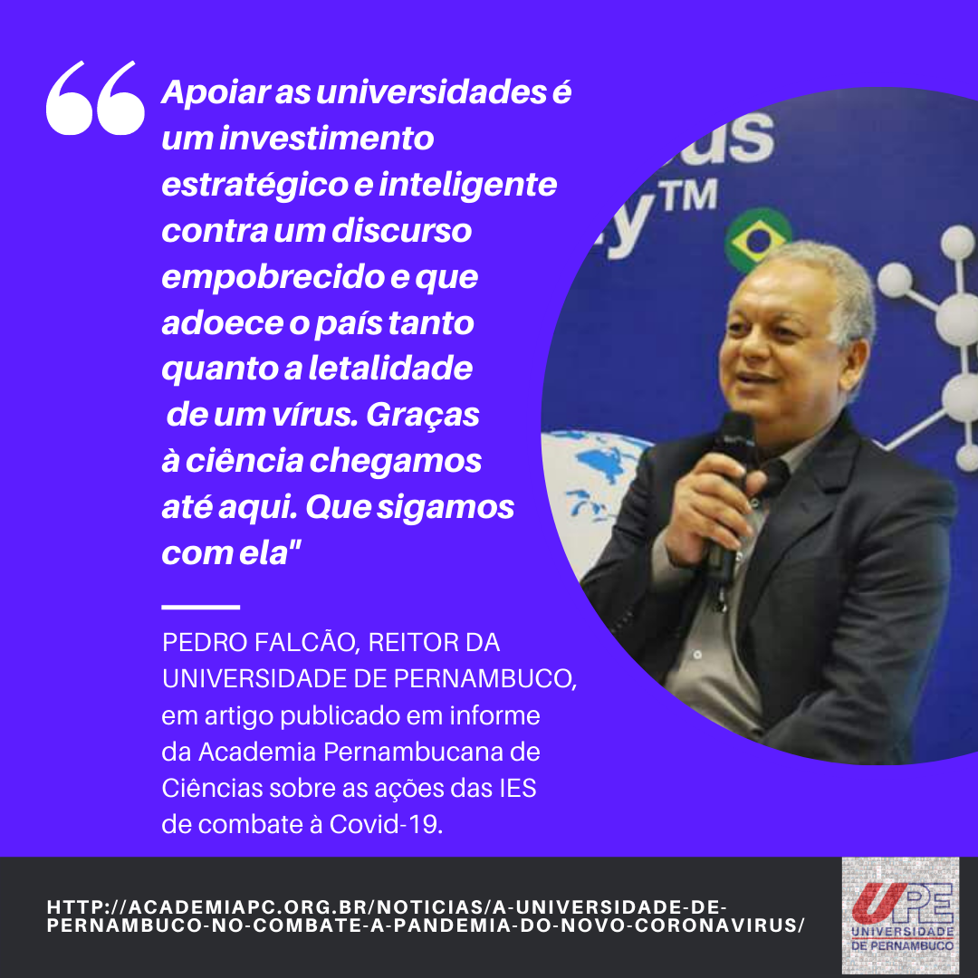 O reitor da Universidade de Pernambuco (UPE) Pedro Falcão publicou artigo no informe da Associação Pernambucana de Ciências (APC) destacando as ações realizadas no combate à pandemia de Covid-19. O link para o conteúdo na íntegra é http://academiapc.org.br/noticias/a-universidade-de-pernambuco-no-combate-a-pandemia-do-novo-coronavirus/.