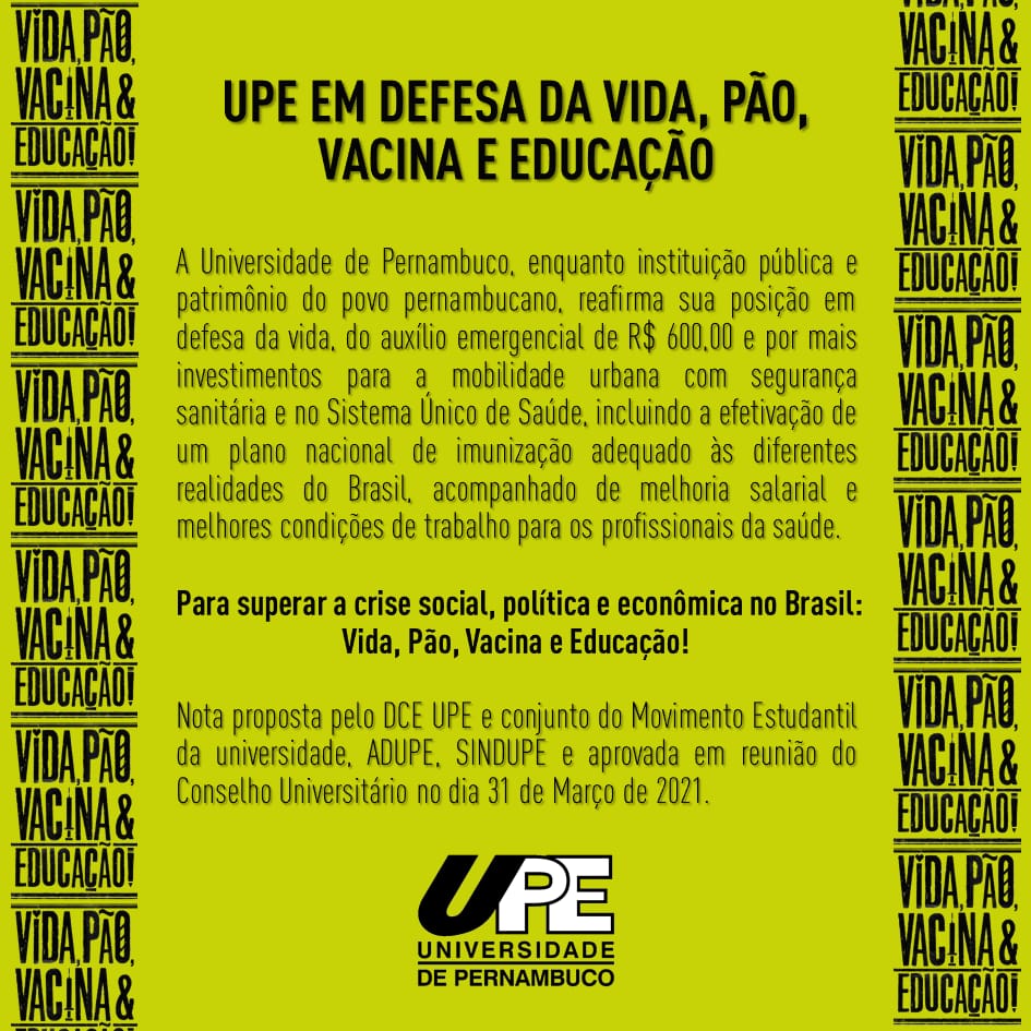 Nota proposta pelos movimentos sociais da UPE e aprovada em reunião do Conselho Universitário