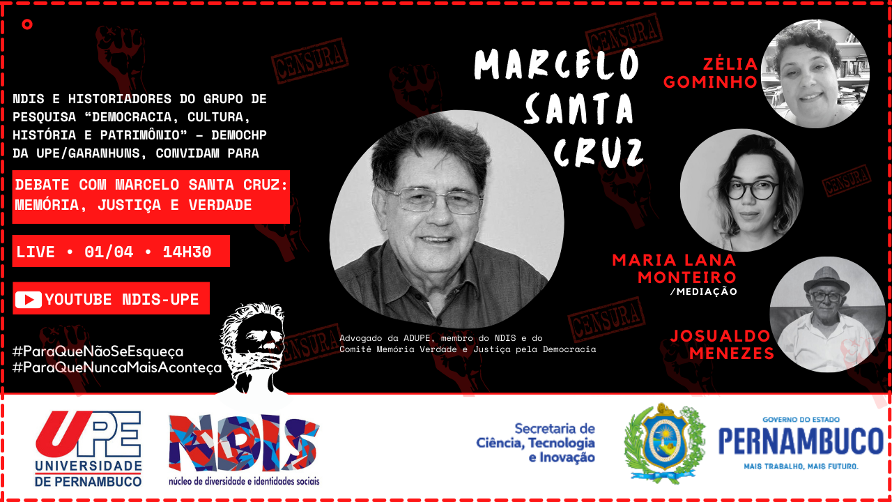 Com o objetivo de promover, difundir e divulgar pesquisas acadêmicas, acervos e diferentes memórias que narram como se deu o golpe de 1964, sua estruturação ao longo de 21 anos, bem como, suas repercussões atuais, o Núcleo de Diversidade e Identidades Sociais (NDIS) da Universidade de Pernambuco (UPE) e o Grupo de Pesquisa “Democracia, Cultura, História e Patrimônio” (DEMOCHP) do campus da instituição em Garanhuns, realizam um debate aberto sobre “Memória, Justiça e Verdade”, que ocorrerá nesta quinta-feira (01/04), a partir das 14h30, no canal do youtube do NDIS.