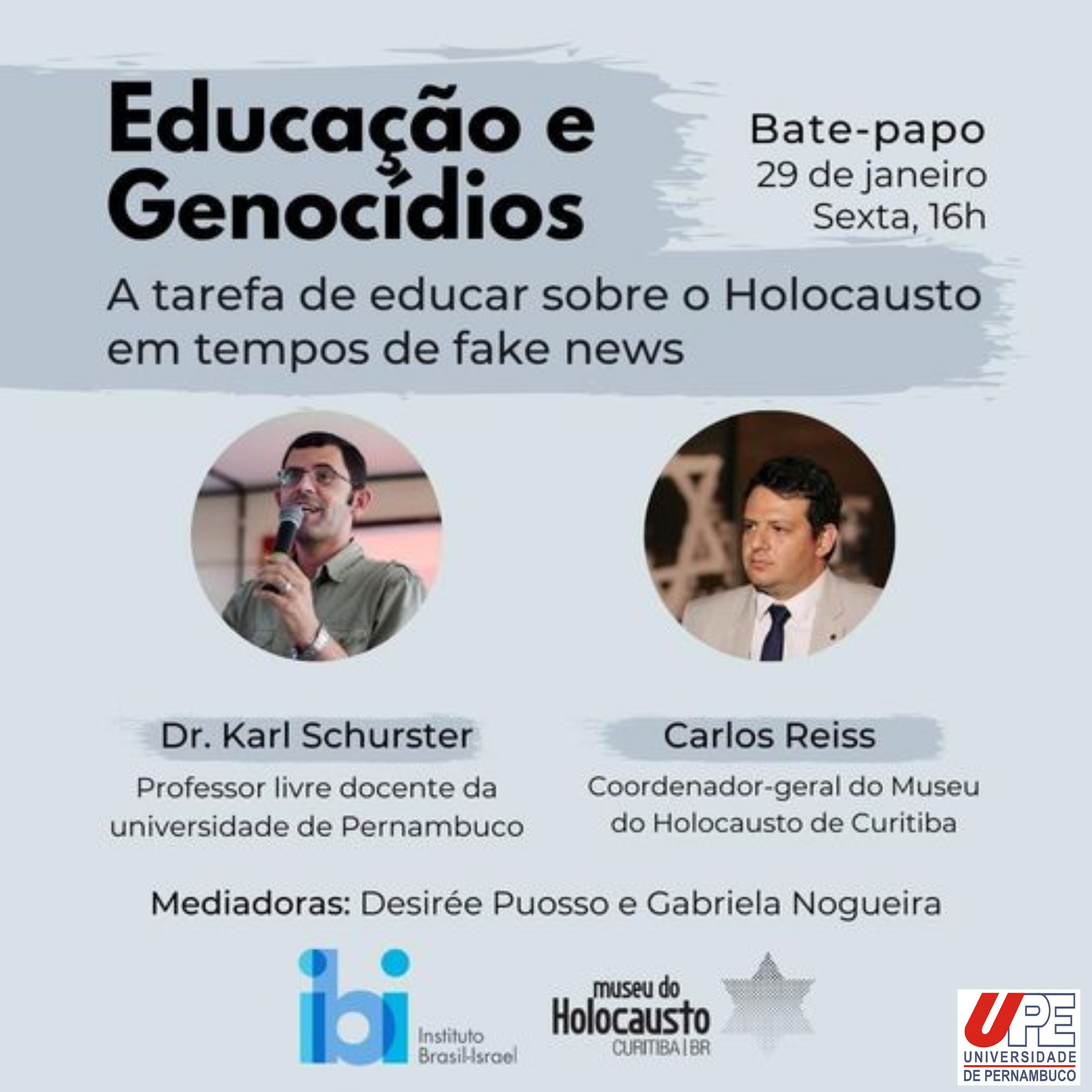 O assessor de Relações Internacionais da Universidade de Pernambuco (UPE), Karl Schurster, participa na sexta-feira (29), às 16h, de um debate sobre “Educação e Genocídios: a tarefa de educar sobre o Holocausto em tempos de fake news”. O bate-papo virtual, que poderá ser acompanhado através do link https://us02web.zoom.us/j/86108570515, será com o coordenador-geral do Museu do Holocausto de Curitiba, Carlos Reiss, com mediação de Desirée Puosso e Gabriela Nogueira. Haverá emissão de certificado para os participantes que solicitarem. O evento é promovido pelo Instituto Brasil-Israel.