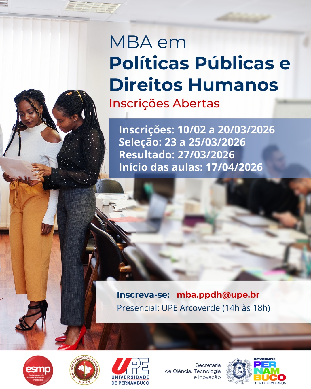 As inscrições devem ser realizadas exclusivamente pela internet, no site institucional da UPE (https://www.upe.br/editais-pos-graduacao.html), no período de 23 de fevereiro a 6 de março de 2026. A prova escrita está prevista para o dia 12 de março, no Recife. O resultado final será divulgado em 18 de março, com matrícula nos dias 19 e 20 de março e início das atividades em 23 de março de 2026.