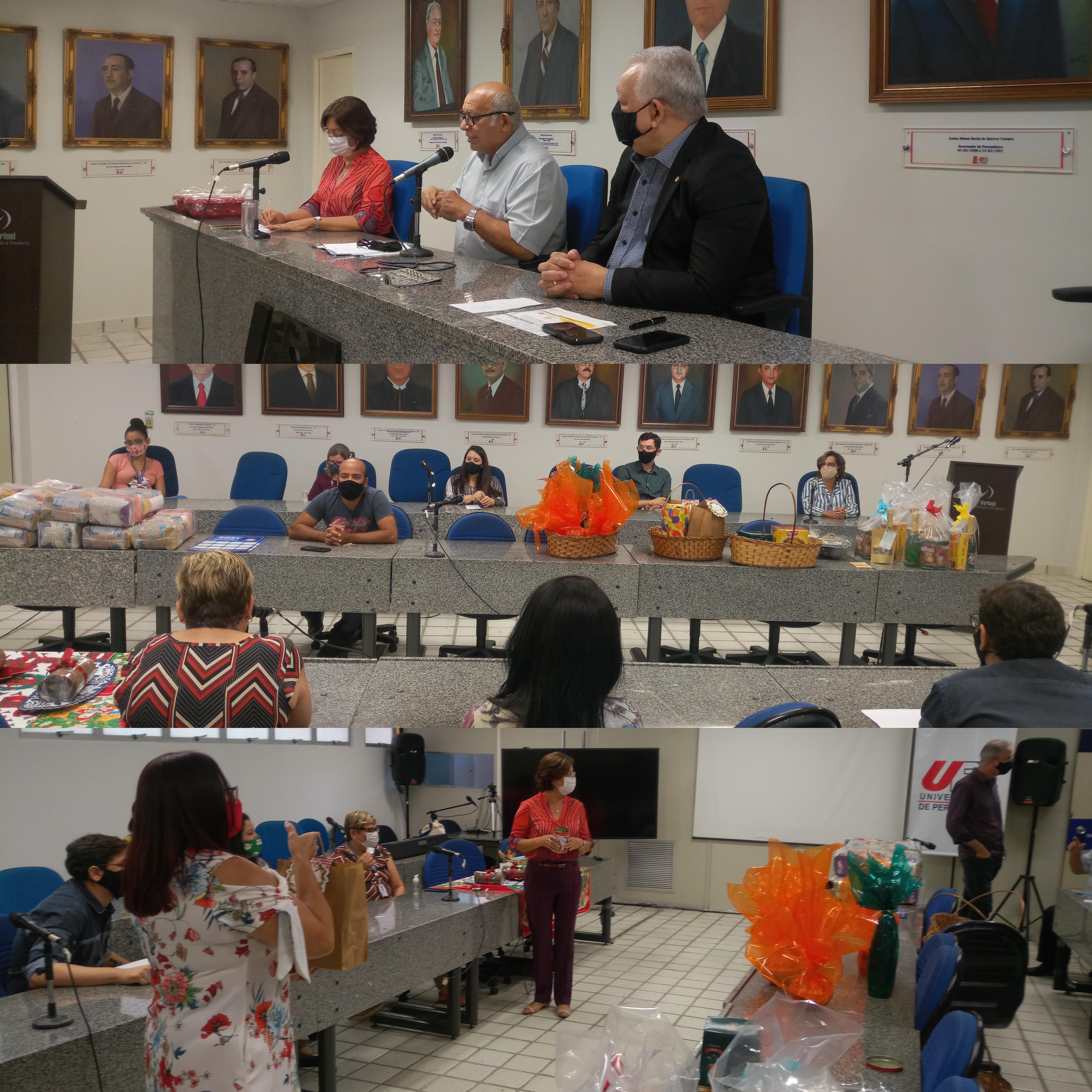 A vice-reitora Maria do Socorro de Mendonça Cavalcanti expressou a sua gratidão a toda a comunidade da UPE pelo apoio às ações desenvolvidas neste ano. “Que 2021 seja muito melhor”, desejou. A solenidade contou com música e, ao final, houve distribuição de cestas básicas aos colaboradores terceirizados e sorteio de kits entre os servidores que estão realizando trabalho presencial na reitoria.