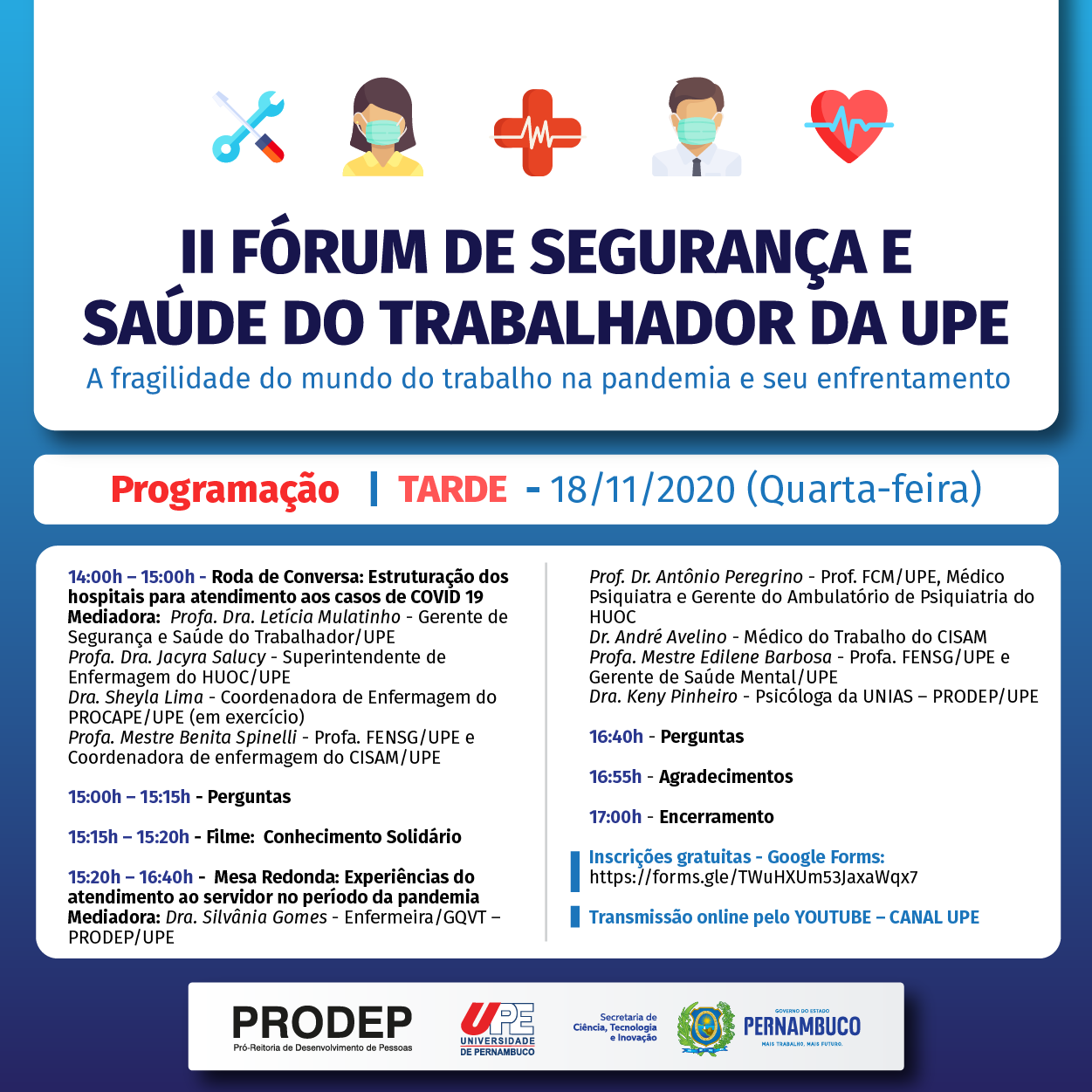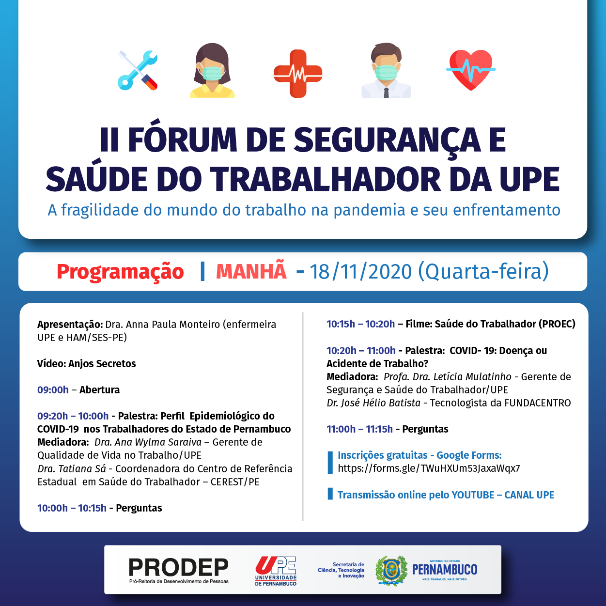 O II Fórum de Segurança e Saúde do Trabalhador da Universidade de Pernambuco pode ser acompanhado pelo canal da UPE no YouTube (https://www.youtube.com/c/CANALUPE). O evento terá ainda os seus debates gravados para acesso público.