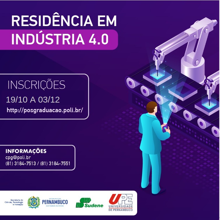 O Programa de Residência Tecnológica em Indústria 4.0 está com inscrições abertas até o dia 3 de dezembro. Resultado de uma articulação da Secretaria de Ciência, Tecnologia e Inovação (SECTI) junto à Superintendência de Desenvolvimento do Nordeste (Sudene) e à Universidade de Pernambuco (UPE), a iniciativa visa incentivar o processo de migração deste setor econômico para o universo digital. Serão abordadas técnicas modernas de computação em nuvem, ciência de dados e inteligência artificial com competências para utilizar ferramentas disponíveis, resolvendo problemas práticos.
