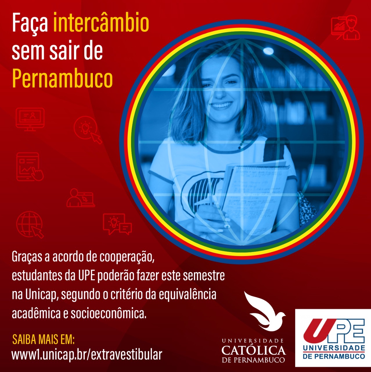 A Universidade Católica de Pernambuco (UNICAP) e Universidade de Pernambuco (UPE), no espírito do Consórcio Pernambuco Universitas, superam barreiras e quebram paradigmas em um acordo histórico. Baseado na lei de Intercambio internacional, o estudante da UPE poderá fazer algumas disciplinas durante um semestre na UNICAP e ser válido na universidade de origem (UPE), através do processo de dispensa de disciplinas. O programa “Intercâmbio sem sair de Pernambuco” responde a uma demanda emergencial por causa da pandemia do novo coronavírus que parou o mundo, mas a aposta é para além do momento atual.