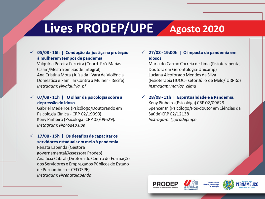 A Pró-Reitoria de Desenvolvimento de Pessoas da Universidade de Pernambuco (Prodep/UPE) continua promovendo, neste mês de agosto, o ciclo de palestras online com especialistas para falar sobre assuntos relacionados sobre bem-estar e para minimizar os efeitos causados pela pandemia do novo Coronavírus (Covid-19).