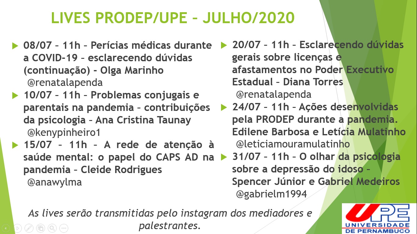 A Pró-Reitoria de Desenvolvimento de Pessoas da Universidade de Pernambuco (Prodep/UPE) dá continuidade, neste mês de julho, sempre às 11h, ao ciclo de palestras online com especialistas para falar sobre assuntos relacionados sobre bem-estar e para minimizar os efeitos causados pela pandemia do novo Coronavírus (Covid-19). As lives acontecem sempre pelo instagram dos palestrantes.