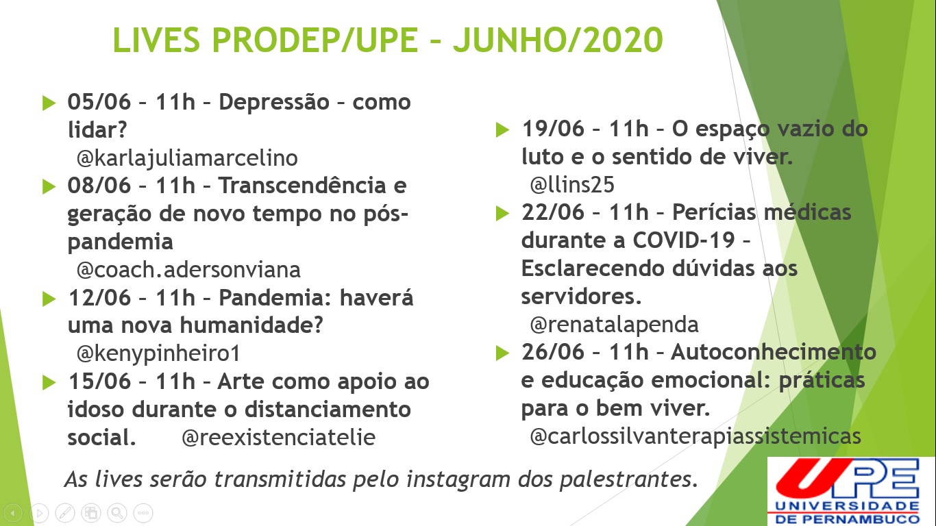 A Pró-Reitoria de Desenvolvimento de Pessoas da Universidade de Pernambuco (Prodep/UPE) dá continuidade, neste mês de junho, sempre às 11h, ao ciclo de palestras online com especialistas para falar sobre assuntos relacionados sobre bem-estar e para minimizar os efeitos causados pela pandemia do novo Coronavírus (Covid-19). As lives acontecem sempre pelo instagram dos palestrantes.