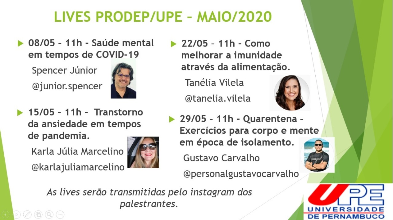 A Pró-Reitoria de Desenvolvimento de Pessoas da Universidade de Pernambuco (Prodep/UPE) realiza, neste mês de maio, sempre às 11h, palestras online com especialistas para falar sobre assuntos relacionados sobre bem-estar e para minimizar os efeitos causados pela pandemia do novo Coronavírus (Covid-19). As lives acontecem sempre pelo instagram dos palestrantes.