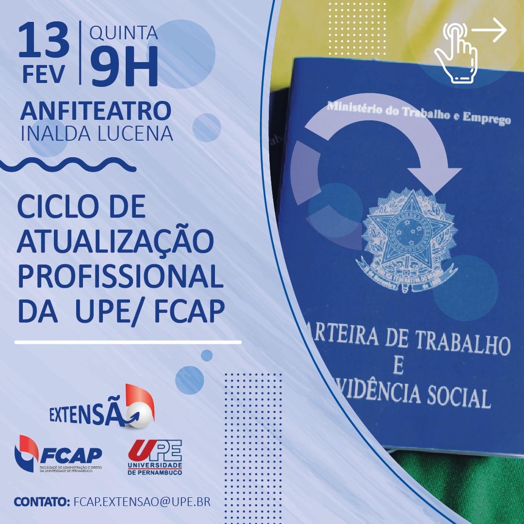 No próximo o mês de fevereiro, a Faculdade de Ciências da Administração e Direito da Universidade de Pernambuco (Fcap/UPE) realiza o “II Ciclo de Atualização Profissional” da unidade, que faz parte do projeto de extensão “Programa de aperfeiçoamento e capacitação dos servidores da Fcap/UPE”.