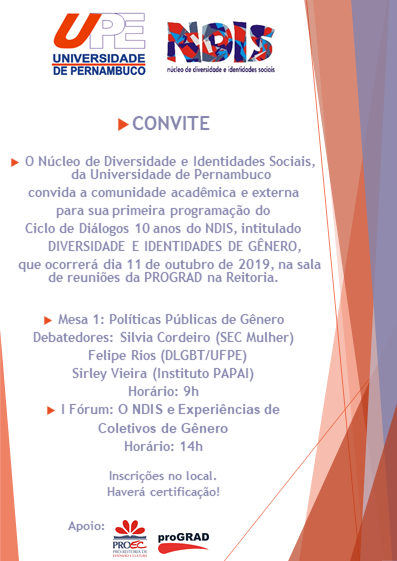 O Núcleo de Diversidade e Identidades Sociais da Universidade de Pernambuco (Ndis/UPE) promove, amanhã (11/10), o “Ciclo de Diálogos – 10 anos do Ndis”.