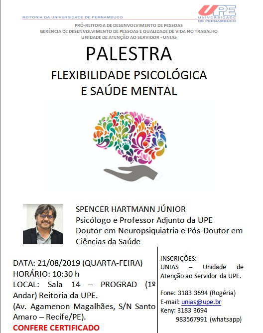 A Pró-Reitoria de Desenvolvimento de Pessoas da Universidade de Pernambuco (Prodep/UPE) realiza, no próximo dia 21/08, às 10h30, a palestra “Flexibilidade psicológica e saúde mental”, proferida pelo professor e psicólogo da UPE, Spencer Hartmann Júnior.