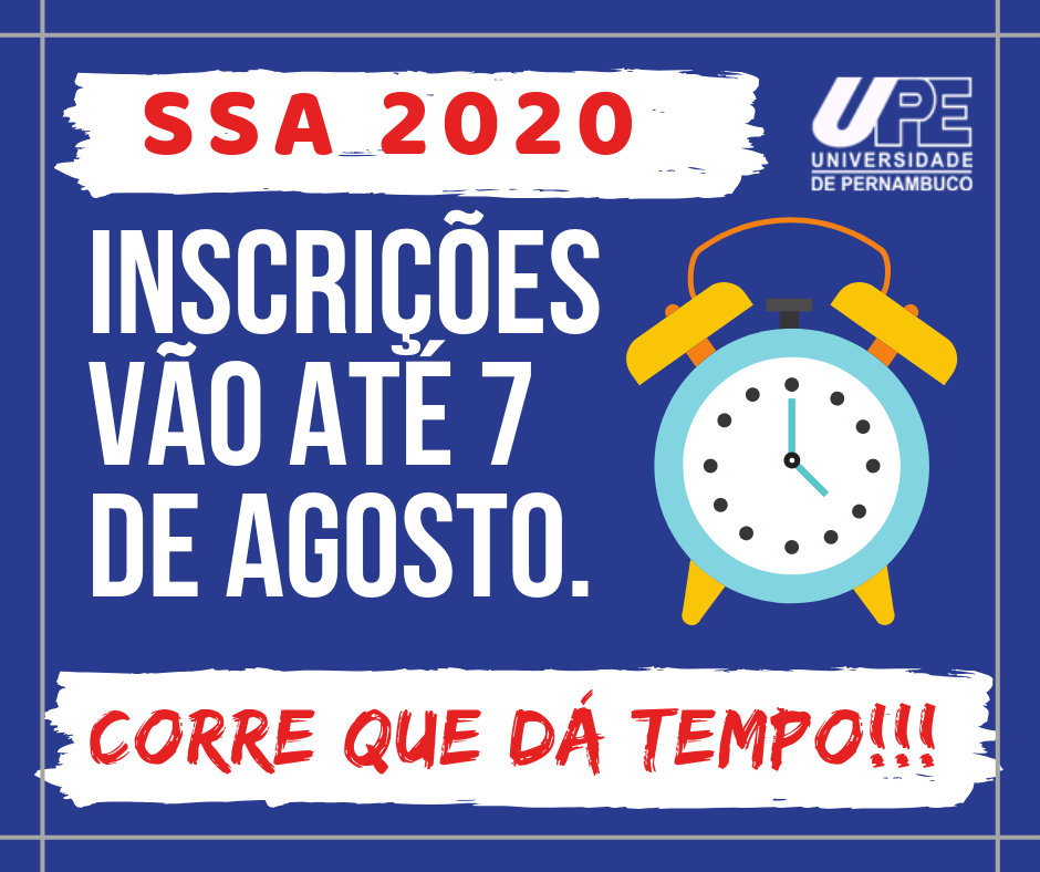 Os interessados em concorrer a uma das 3.480 vagas ofertadas pelo Sistema Seriado de Avaliação da Universidade de Pernambuco (SSA/UPE) têm até a próxima quarta-feira (07/08) para efetuarem suas inscrições, exclusivamente, pela Internet, através do endereço eletrônico: http://processodeingresso.upe.pe.gov.br. A taxa custa R$ 100,00 e deverá ser paga até o dia 09/08 impreterivelmente.