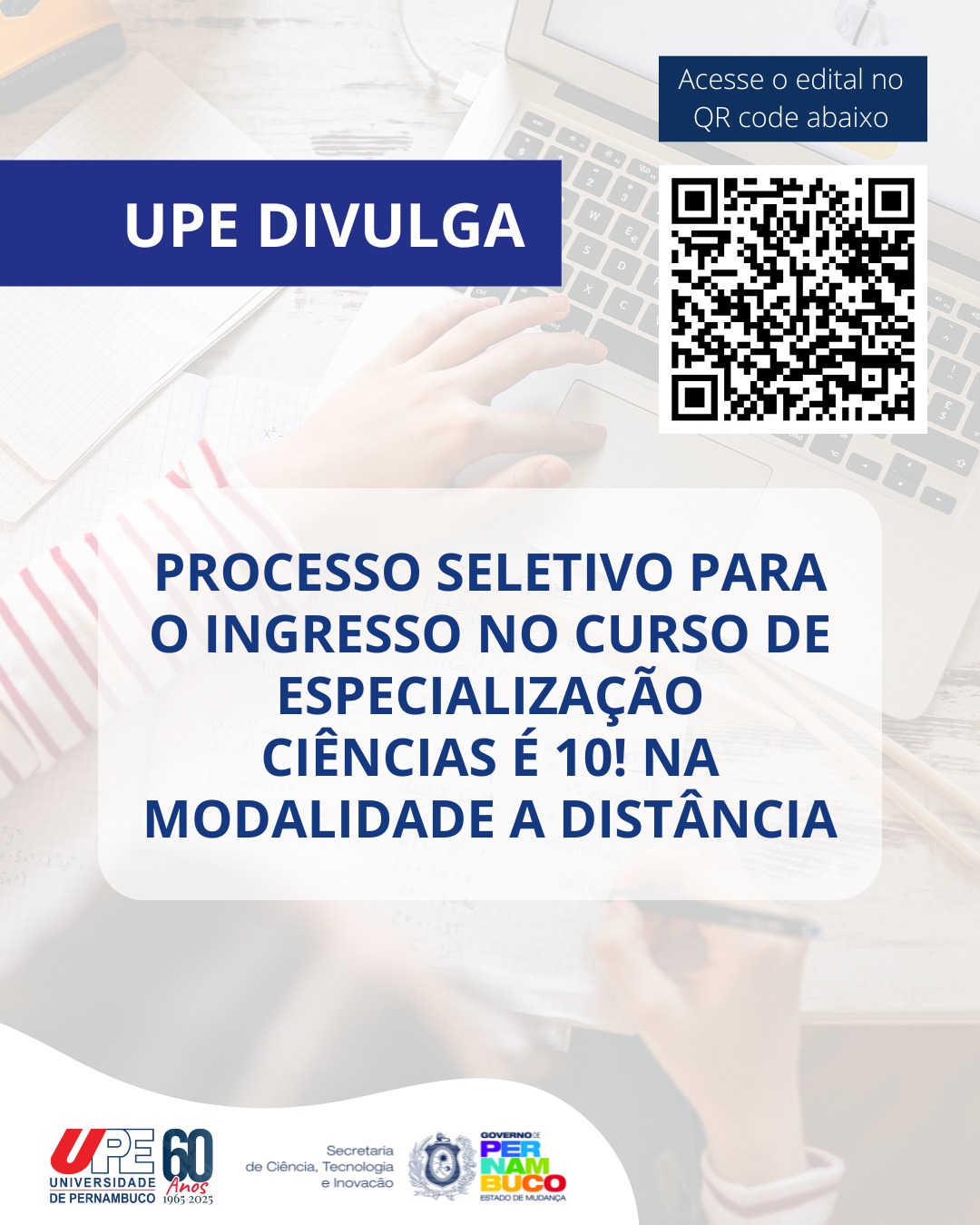 A Universidade de Pernambuco (UPE), por meio da Diretoria de Educação a Distância (DED-UPE), torna público o processo de seleção de discentes para ingressar no curso de Especialização em Ensino da Ciências - Ciências é 10! (C10), na modalidade a distância, do programa da Universidade Aberta do Brasil (UAB).