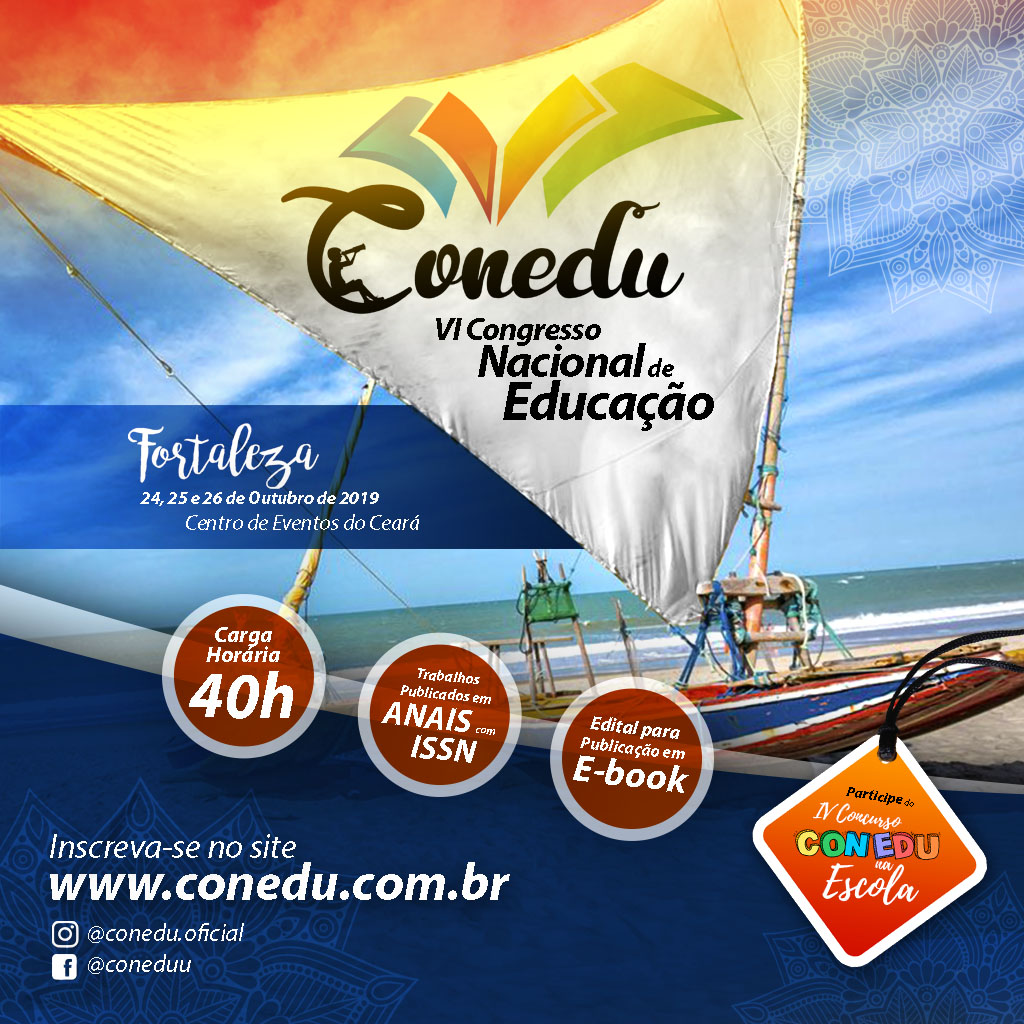 O 6º Congresso Nacional de Educação (CONEDU) será sediado no Centro de Eventos do Ceará, em Fortaleza/CE, durante os dias 24, 25 e 26 de outubro de 2019. O evento visa promover ações de caráter inovador e tecnológico incentivando a produção acadêmica para a melhoria da qualidade da educação básica e superior no Brasil.