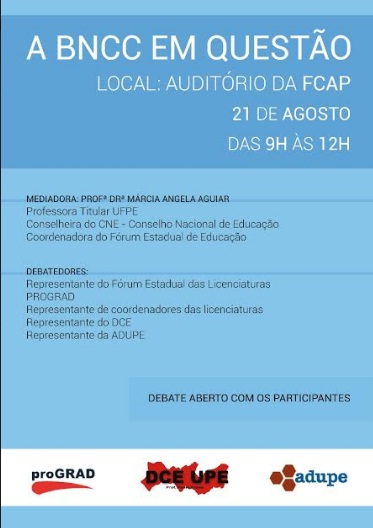 Na próxima terça-feira (21/08), das 9h às 12h, no auditório da Faculdade de Administração e Direito da Universidade de Pernambuco (Fcap/UPE) haverá um debate aberto sobre a Base Nacional Comum Curricular (BNCC) com representantes da UPE, UFPE, DCE, CNE.