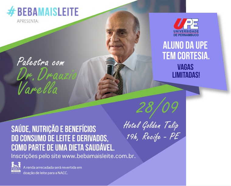 Na próxima quinta-feira (28/09) o médico Drauzio Varella estará no Recife para uma palestra sobre “Saúde, Qualidade de Vida, Alimentação”. Ele falará ainda sobre mitos e verdades na alimentação, como a atual polêmica do consumo de lácteos.