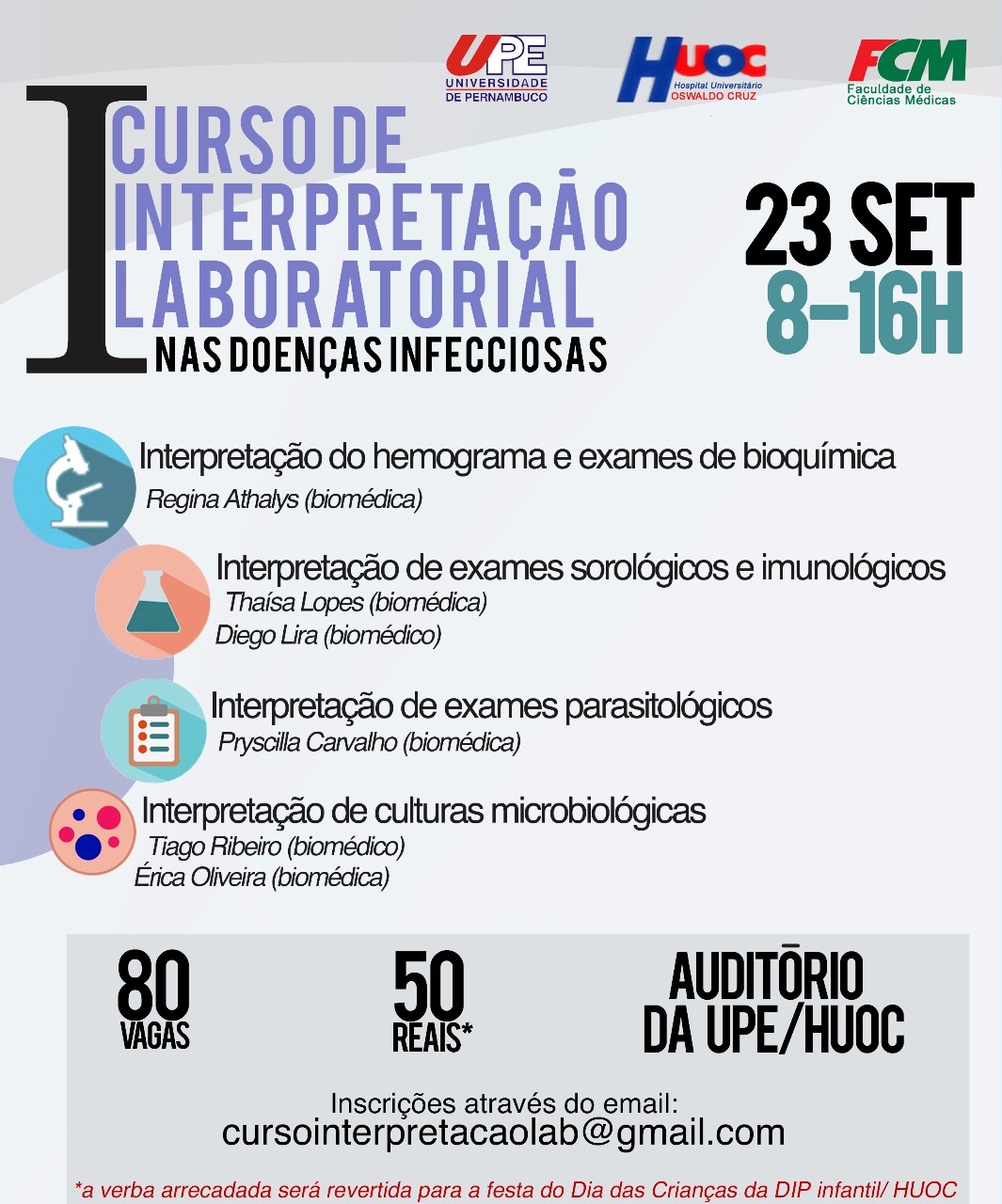 A Universidade de Pernambuco (UPE) promove no dia 23 de setembro, das 8h às 16h o curso de Interpretação Laboratorial nas Doenças Infecciosas. O encontro será realizado no auditório Jayme Scherb e abordará temas como “interpretação de culturas microbiológicas”, “interpretação do hemograma e exames de bioquímica”, entre outros. Os interessados podem se inscrever através do email: Este endereço de email está sendo protegido de spambots. Você precisa do JavaScript ativado para vê-lo..