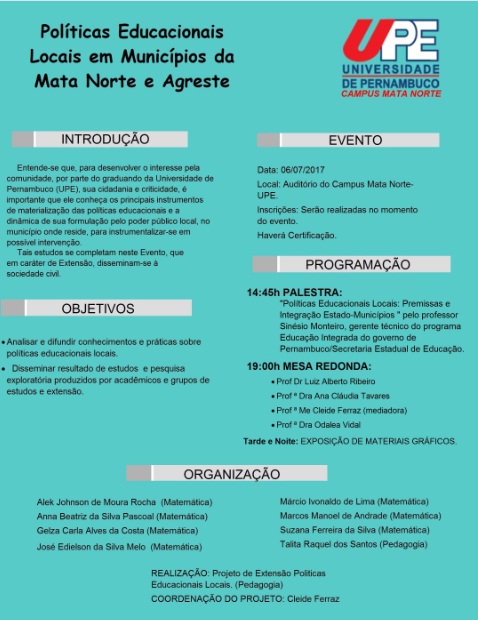 A Universidade de Pernambuco (UPE) campus Mata Norte promove, nesta quinta-feira (06/07), das 14h45 às 19h, palestra sobre “Políticas Educacionais Locais em Municípios da Mata Norte e Agreste” ministrada pelo Prof. Sinésio Monteiro de Melo Filho, gerente técnico do programa Educação Integrada da Secretaria Estadual de Educação. O encontro será no auditório da unidade. Durante a ocasião, os presentes vão participar de uma mesa redonda para debaterem sobre o tema.