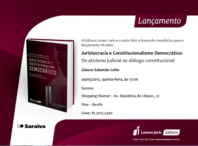 No próximo dia 04 de maio, às 17h, na livraria saraiva do Shopping Rio Mar, acontece o lançamento do livro Juristocracia e Constitucionalismo Democrático – do ativismo judicial ao diálogo constitucional, de autoria do professor de Direito da FCAP/UPE, Glauco Salomão Leite.