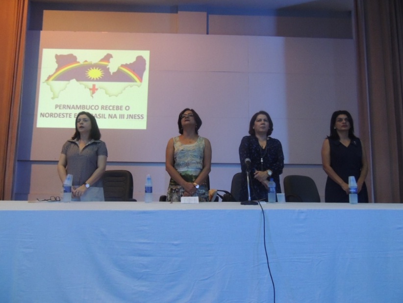 Compuseram a mesa de abertura a vice-reitora da UPE, Profª Socorro Cavalcanti, as professoras Maria Auxiliadora Campos e Elisabeth Alcoforado, diretora dos campi Mata Norte e Sul e a coordenadora do curso de Serviço Social do campus Mata Sul da universidade, respectivamente. Além da professora Sandra Simone Araújo, representando a coordenação geral do evento.