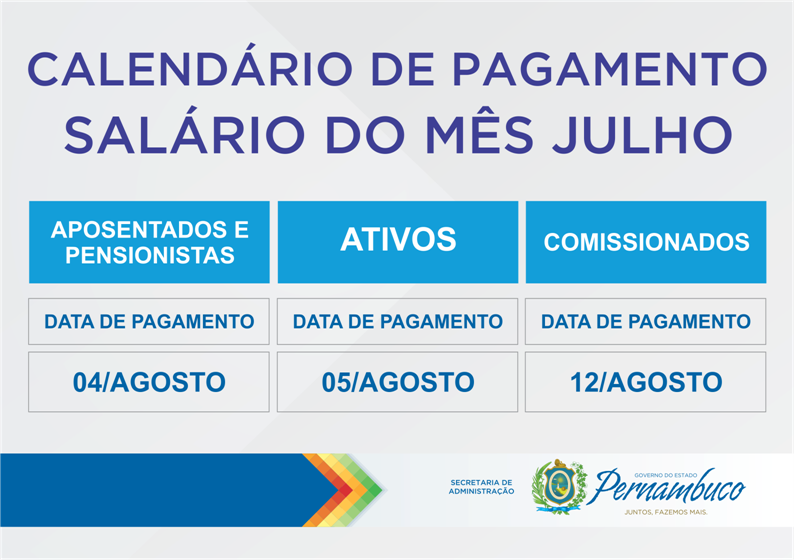 A Secretaria de Administração (SAD) informa que o salário do mês de JULHO, dos servidores públicos estaduais, será pago nas seguintes datas: dia 04 de agosto - aposentados e pensionistas e dia 05 de agosto - ativos. Já os comissionados receberão no dia 12 de agosto.