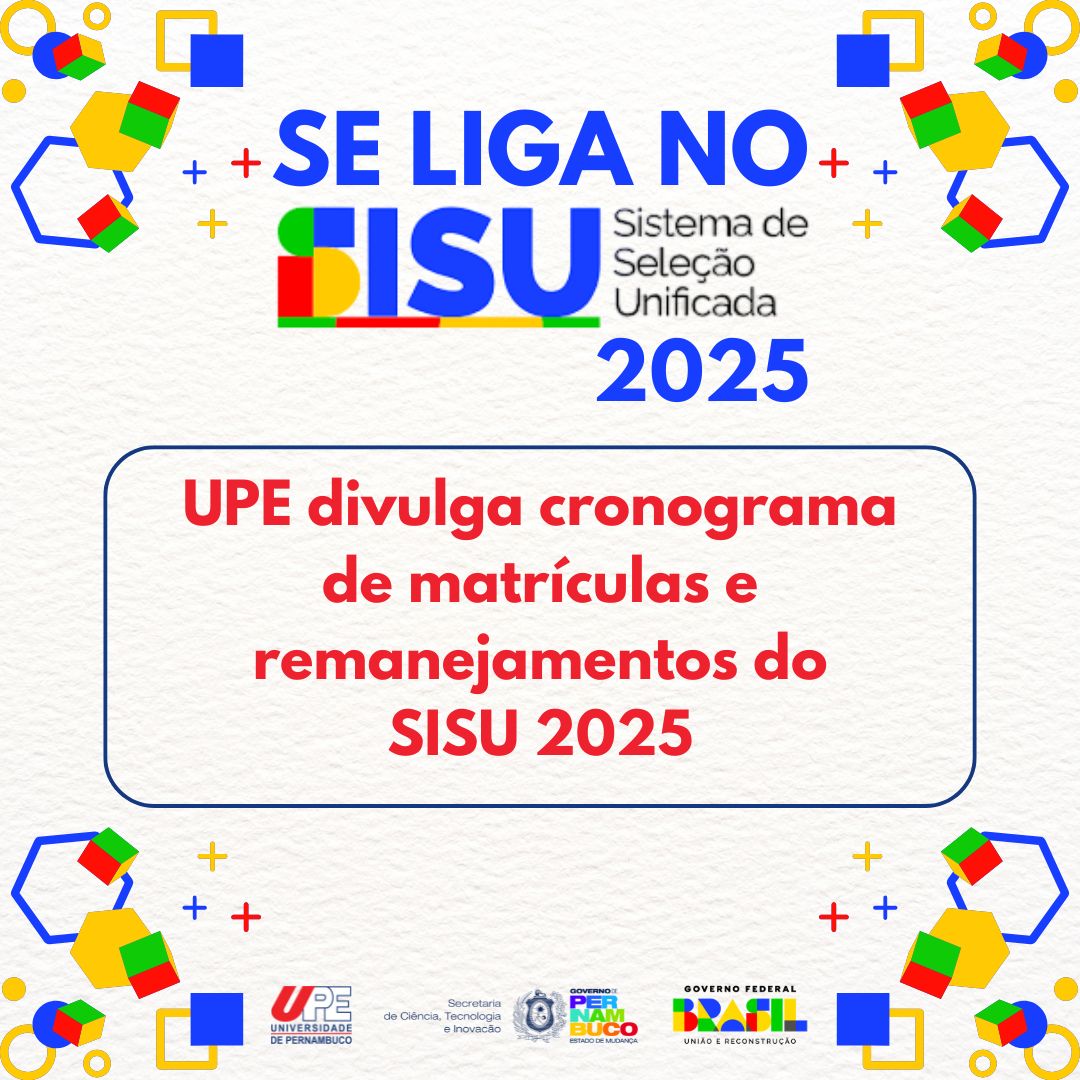 A Universidade de Pernambuco, a partir da Pró-Reitoria de Graduação, juntamente com a Comissão Permanente de Concursos Acadêmicos, publicou o cronograma de matrícula dos estudantes ingressantes pelo Sistema de Seleção Unificada (SISU) 2025. As informações complementares então no site do processo de ingresso: http://processodeingresso.upe.pe.gov.br