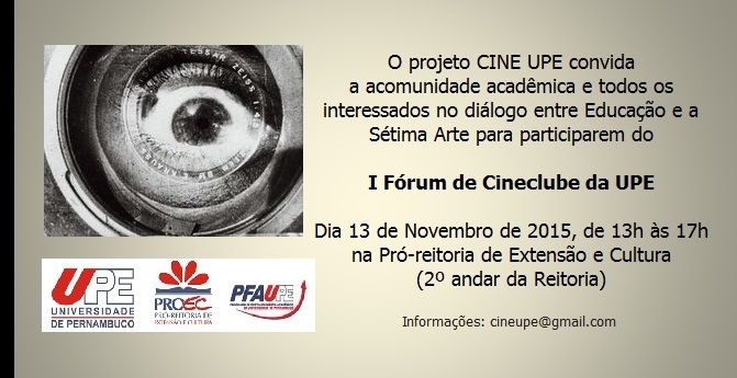 Sexta-feira (13/11) é dia de Cine UPE. O projeto vai realizar, no horário das 13h às 17h, na Pró-reitoria de Extensão e Cultura da instituição, no 2º andar da Reitoria, o 1º Fórum de Cineclube, com programação aberta ao público interessado no diálogo entre educação e cinema. Na programação desse mesmo dia ainda tem apresentação de projetos de ensino, pesquisa e extensão sobre a temática.