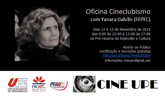 OFICINA – Antes, nos dias 11 e 12/11, das 9h às 12h e das 13h às 17h, também na Proec, haverá uma oficina ministrada por Yanara Galvão, diretora da Federação Pernambucana de Cineclubes (FEPEC). As atividades são abertas, gratuitas e com certificação. Haverá video-conferência para unidades do interior. O Cine UPE é reslizado sob a coordenação da professora Maria Lana Monteiro. Inscrições aqui. Mais informações: Este endereço de email está sendo protegido de spambots. Você precisa do JavaScript ativado para vê-lo..