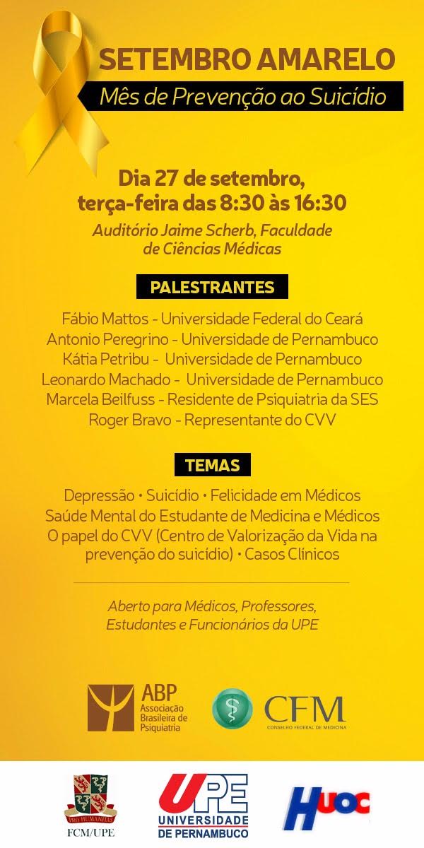 O “setembro amarelo” é o mês dedicado à prevenção ao suicídio e a Universidade de Pernambuco (UPE) promove evento sobre o assunto. No próximo dia 27, das 8h30 às 16h30, acontece um “Simpósio sobre Suicídio” no auditório Jaime Scherb, na Faculdade de Ciências Médicas.