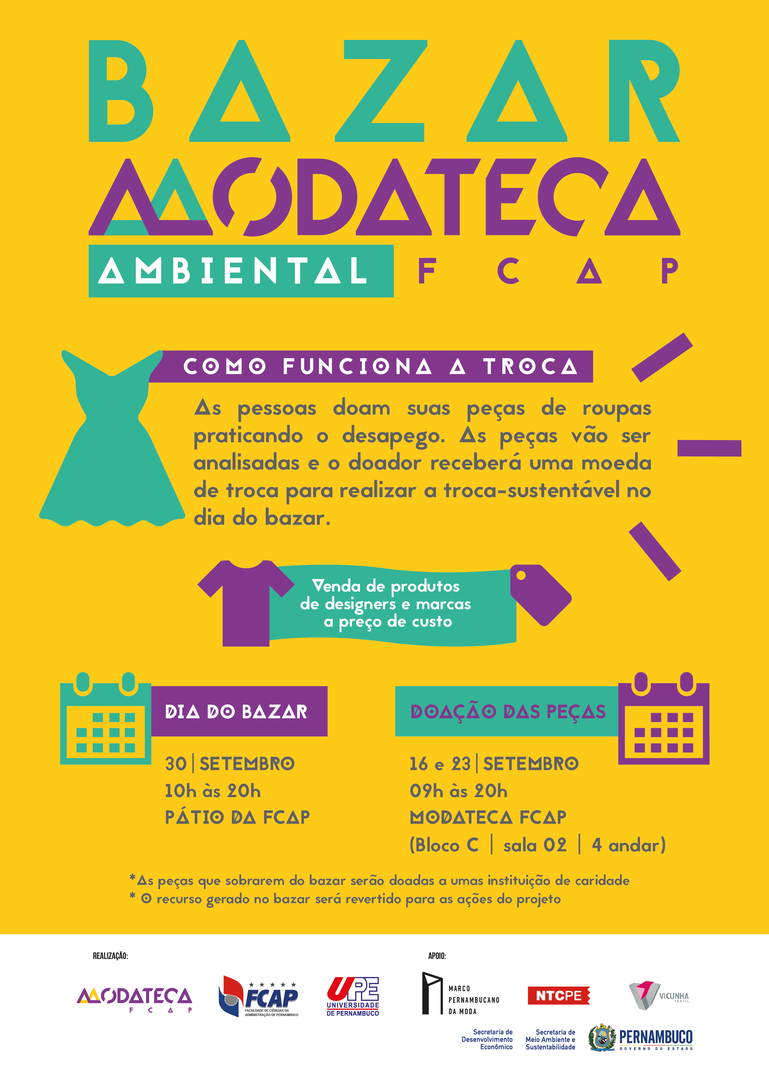 No dia 30 deste mês, o Projeto de Extensão Modateca Ambiental FCAP, da Universidade de Pernambuco (UPE), promove o Bazar de Troca, no horário das 10h às 20h, no pátio da unidade de ensino, localizada no bairro da Madalena, no Recife.