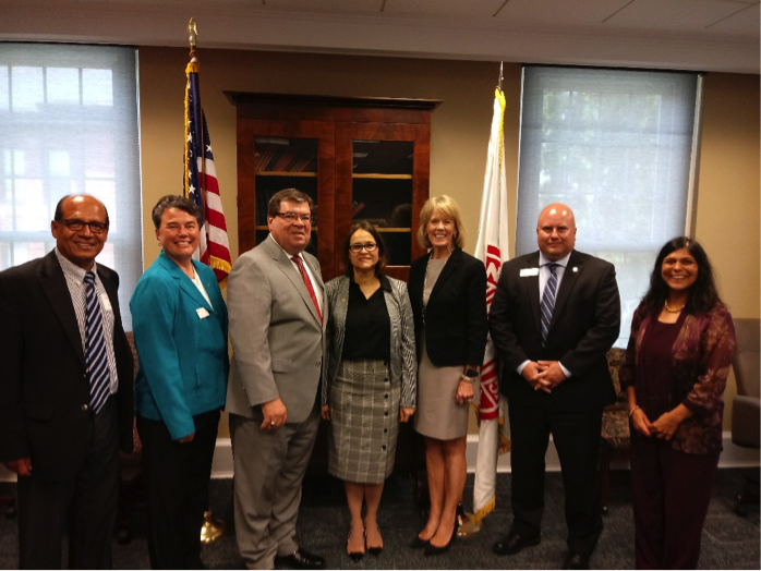 Professora Tereza foi recebida pelo Reitor da Universidade do Illinóis, Larry H. Dietz, pelo diretor de Relações Internacionais, Luis Canales, e pela pesquisadora, Anuradha Gokhale.