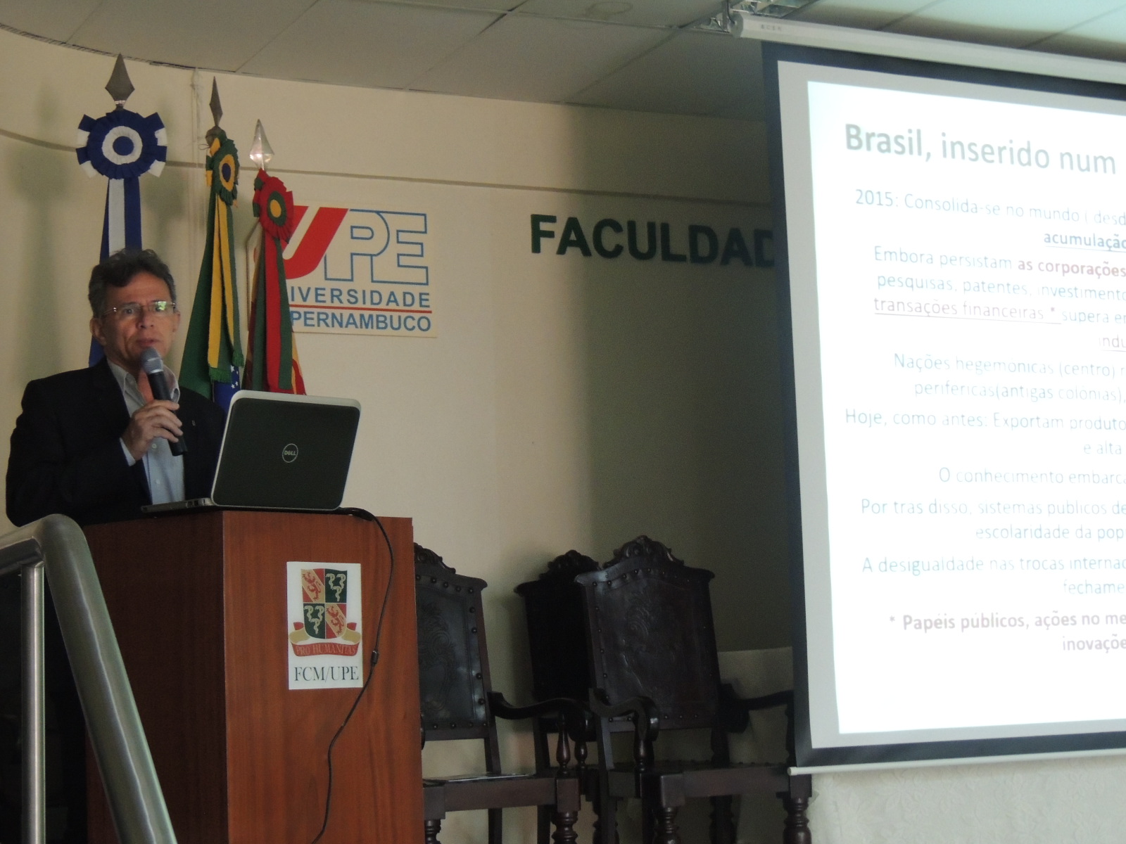Ele falou sobre os motivos de se investir em educação, como o acesso a cidadania, o aumento da renda em 10% por um ano a mais de escolaridade, os ganhos sociais com saúde e segurança e a redução da desigualdade de renda. Também mostrou estatística sobre interpretação. Segundo o estudo apresentado, apenas 25% dos brasileiros conseguem ler uma notícia de jornal e interpretar. Ressaltou alguns avanços na área, como a ampliação da oferta, a redução da defasagem e a idade-série, entre outros pontos. No final, agradeceu a todos e concluiu dizendo que os professores “são heróis da resistência”. Os participantes puderam fazer perguntas ao palestrante num debate mediado pelos professores da UPE Karl Schurster e Luiz Alberto Rodrigues, pró-reitor de Graduação.