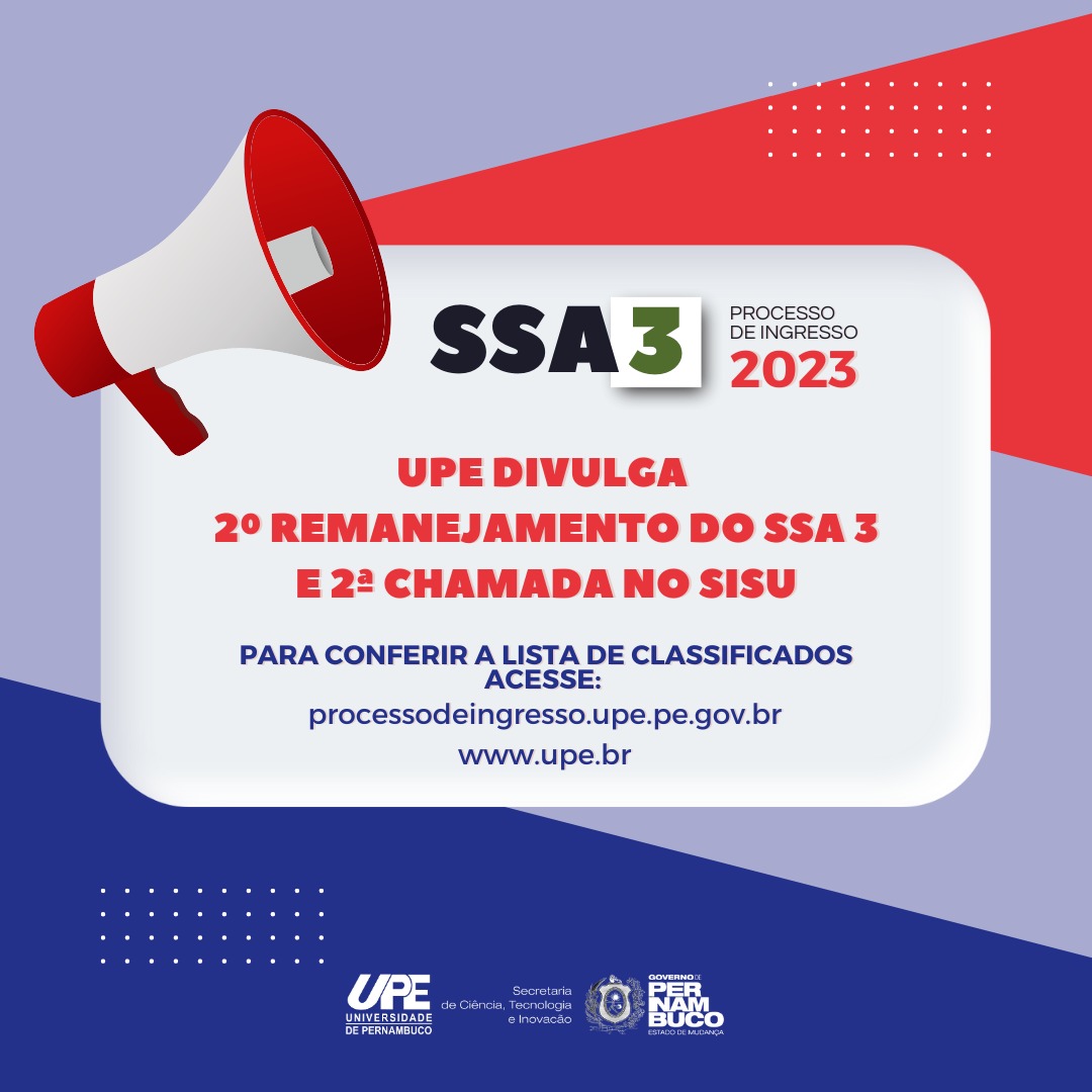 A Comissão Permanente de Concursos Acadêmicos da Universidade de Pernambuco (CPCA/UPE) divulgou nesta quinta-feira (20) as listagens do 2º remanejamento do Sistema Seriado de Avaliação (SSA 3) e do Sistema de Seleção Unificada (Sisu). Adicionalmente também foram publicadas as listas de classificados por entrada, para ambos os processos de ingresso.
